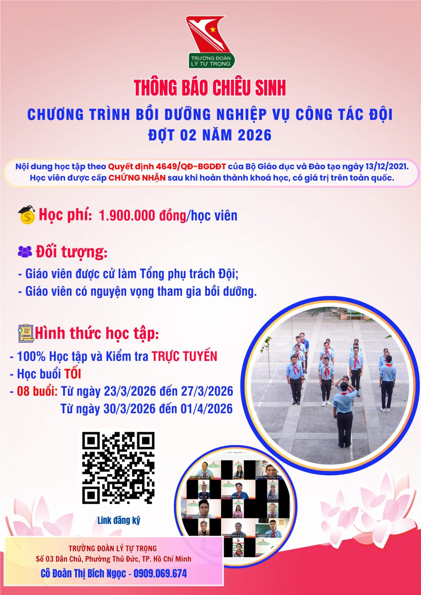 Nhằm chuẩn hóa đội ngũ và nâng cao năng lực chuyên môn cho đội ngũ Giáo viên Tổng phụ trách Đội, cán bộ Đoàn – Đội tại các cơ sở giáo dục, Trường Đoàn Lý Tự Trọng chính thức thông báo chiêu sinh chương trình Bồi dưỡng Nghiệp vụ Công tác Đội – Đợt 02 năm 2026.
